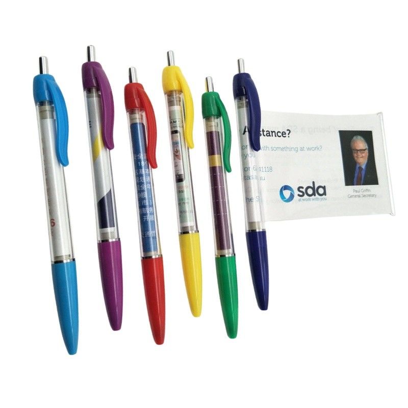 A plastic banner ball pen is a type of promotional pen that typically features a retractable ballpoint tip and a plastic barrel. What makes it unique is the banner aspect, where a small, customizable banner can be inserted into the pen's clip or barrel, allowing for a message, logo, or advertisement to be prominently displayed. These pens are often used as marketing tools or promotional giveaways at events, trade shows, or as part of advertising campaigns. They offer a cost-effective way to spread brand awareness and convey messages to a wide audience.