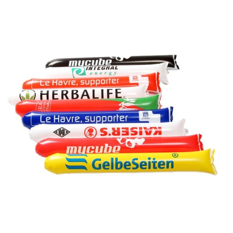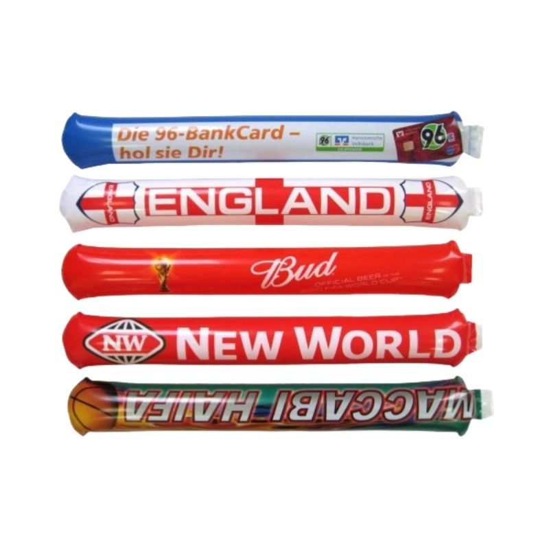 Cheering sticks, also known as thundersticks or bam bams, are inflatable plastic tubes used to create noise and excitement at events such as sports games, concerts, and rallies. Typically, they are made of polyethylene and are inflated by banging them together or using a small straw to blow air into them. When struck against each other or any other surface, they produce a loud noise, making them a popular choice for cheering on teams or performers. They're often seen in large crowds, adding to the energetic atmosphere of the event.